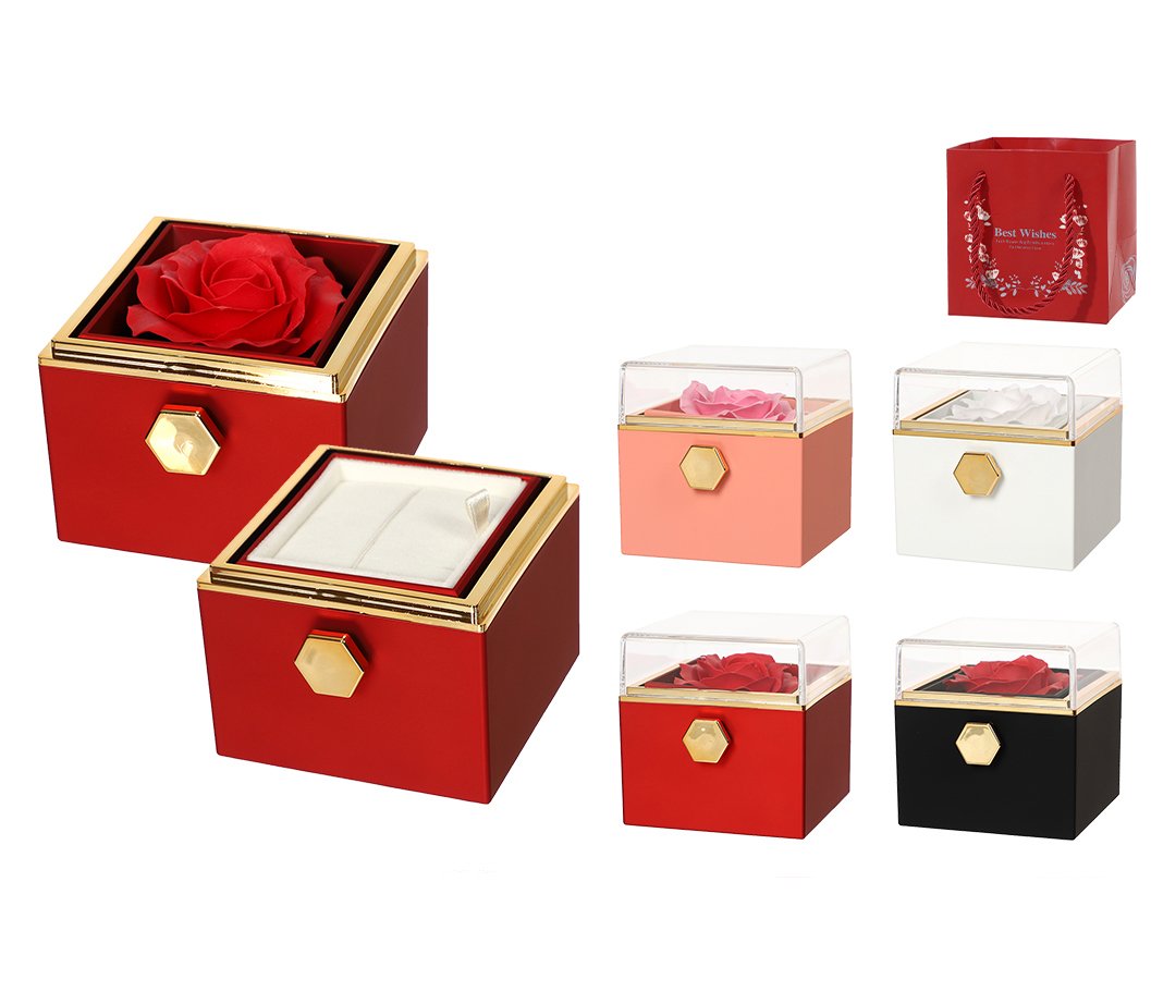 Elegantes cajas de joyero con rosa, diseñadas para realzar cualquier regalo romántico. Cada modelo combina flores eternas, compartimentos para joyas y una presentación premium con bolsa a juego. Ideales para San Valentín, aniversarios y detalles especiales que requieren una presentación cuidada y de alta calidad.
