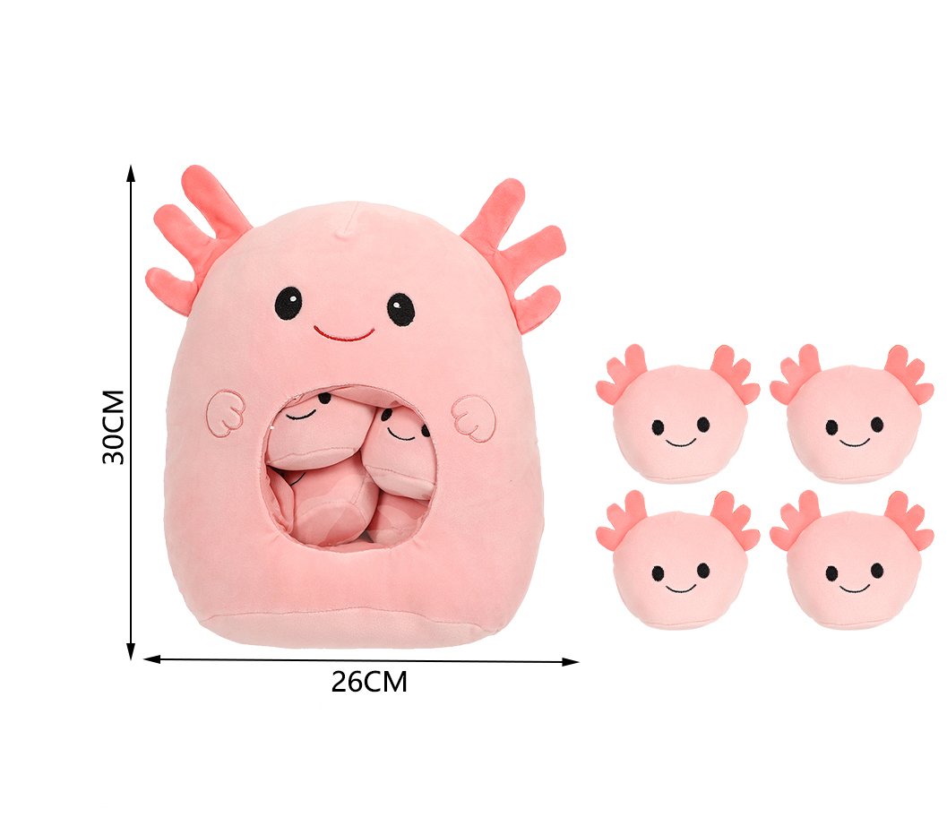 Cojín de peluche 5 en 1, con un diseño grande y cuatro mini peluches combinados. Suave, decorativo y divertido, ideal para regalos, tiendas infantiles y campañas de temporada.