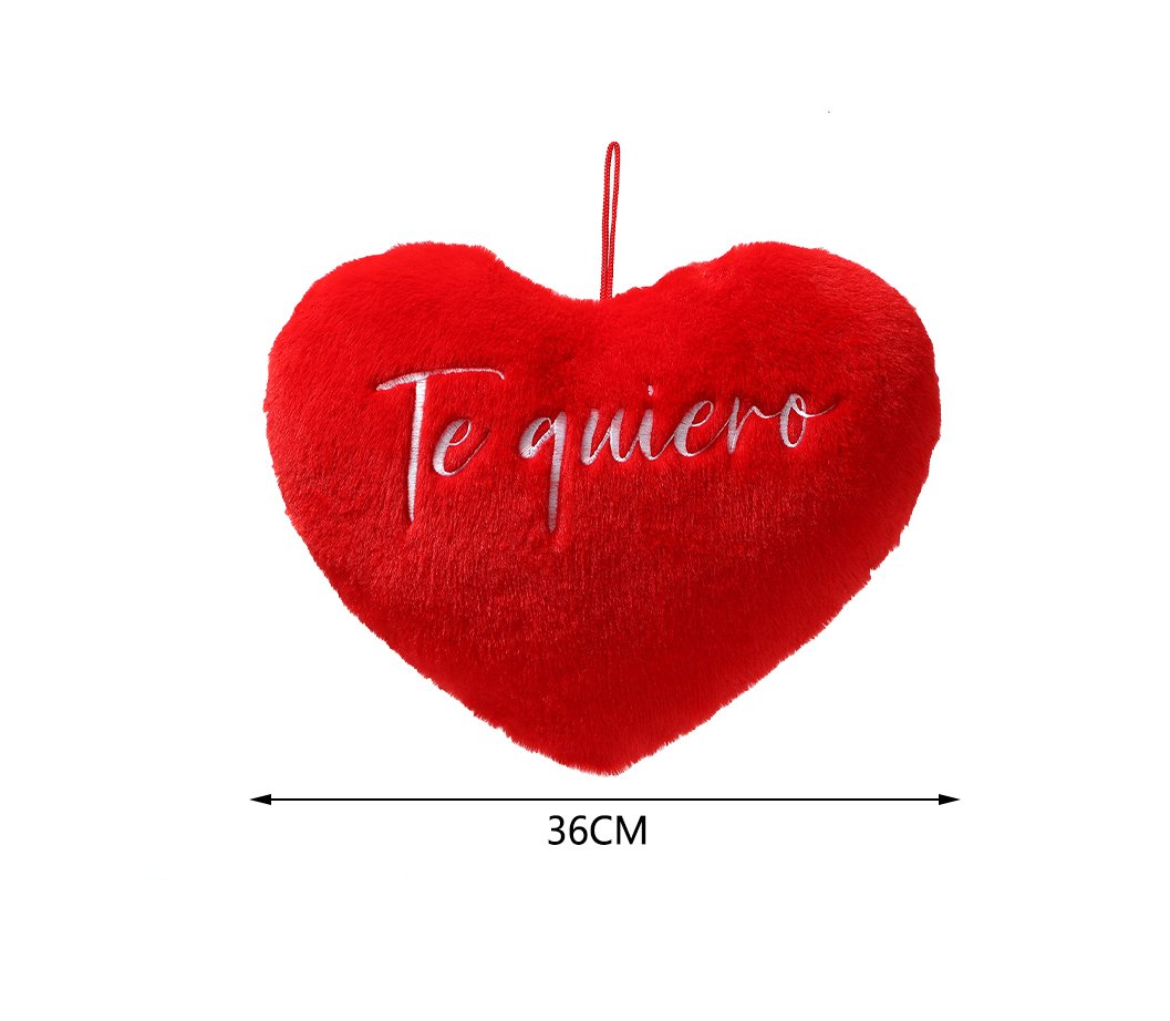 Cojines de peluche con forma de corazón, suaves y agradables al tacto. Disponibles en varios diseños bordados como Te Amo, Te Quiero o I Love You. Ideales para detalles románticos, decoración y temporadas especiales como San Valentín.