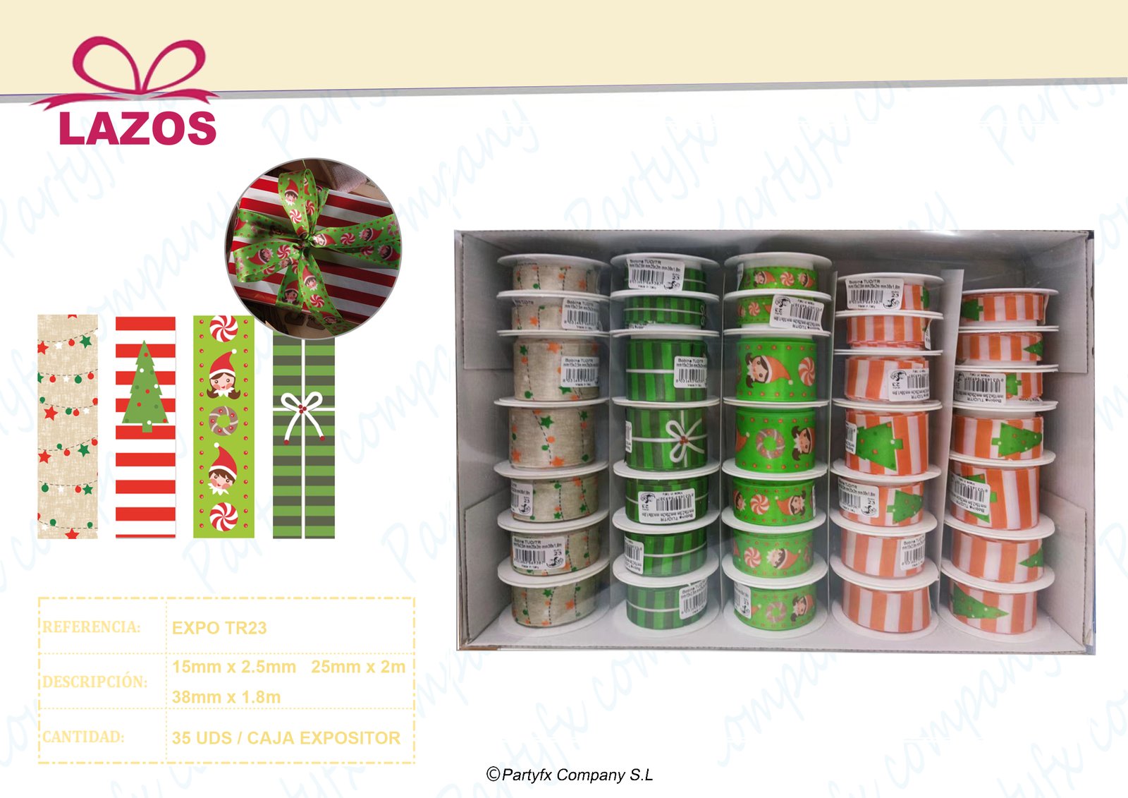 Lazos decorativos surtidos para regalo, disponibles en diferentes colores, tamaños y diseños. Ideales para decorar bolsas, cajas y paquetes de regalo, aportando un acabado atractivo y festivo. Perfectos para campañas estacionales, eventos y venta al por mayor.