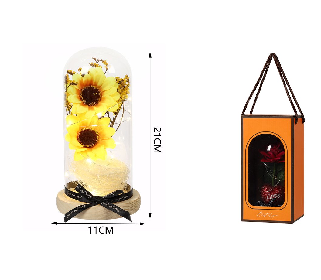 Elegantes flores preservadas dentro de una cúpula de cristal, combinadas con detalles decorativos y base de madera. Cada pieza incluye iluminación LED suave, ideal para crear un ambiente romántico y sofisticado. Perfecto para regalos, decoración del hogar y ocasiones especiales.