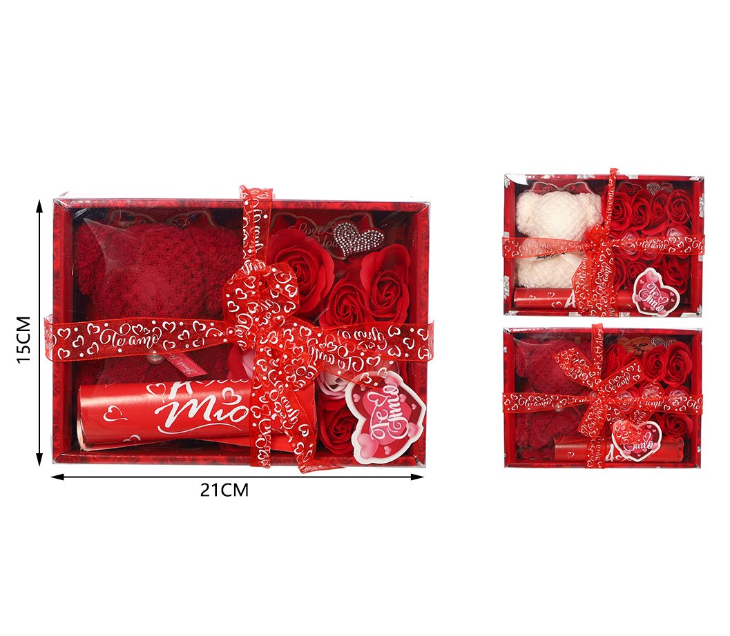 Regalos romanticos con rosas, peluches y sets especiales presentados en cajas decorativas.Ideales para San Valentin y detalles que buscan un estilo elegante y listo para regalar.