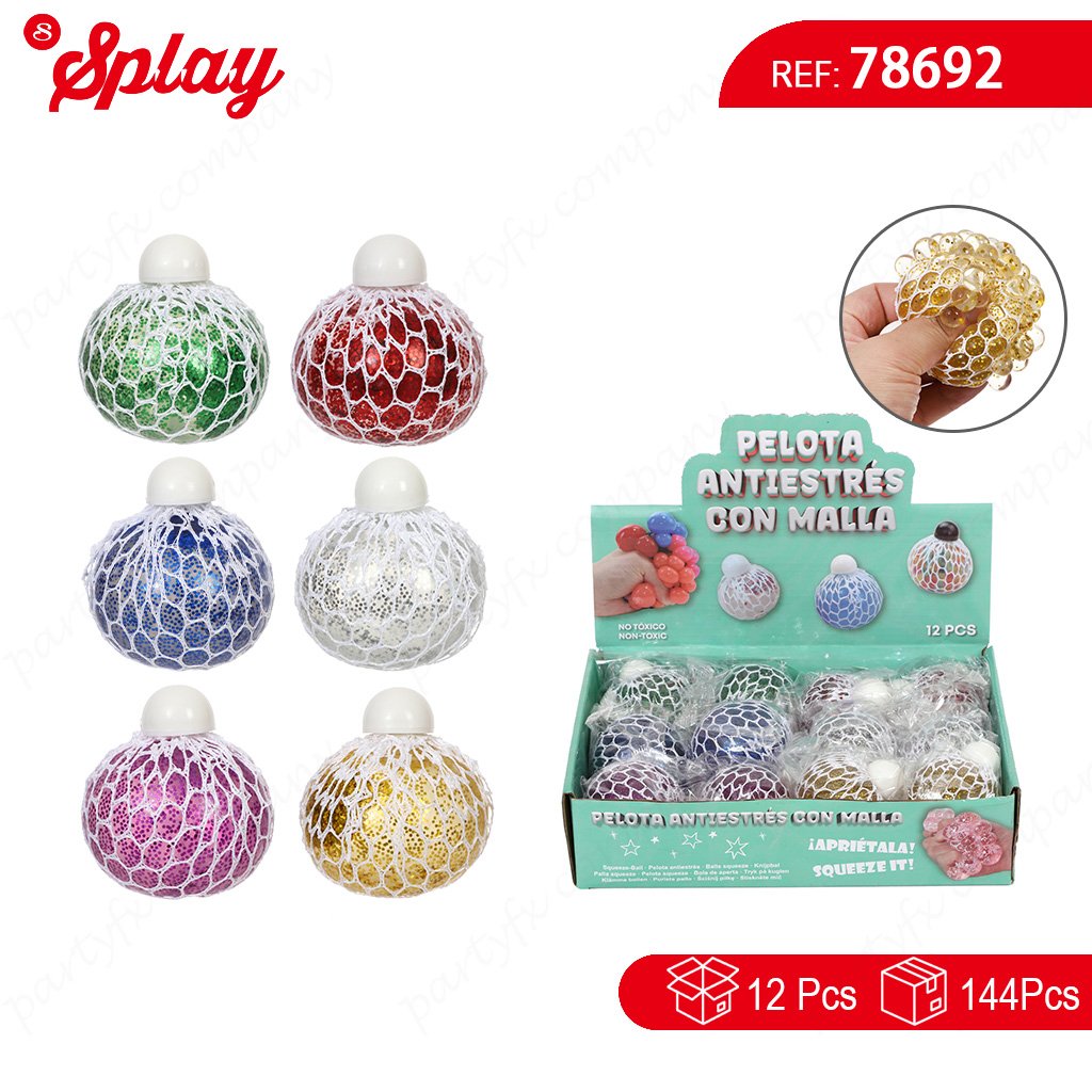 Pelota antiestrés con malla que crea efecto burbuja al presionar. Material suave y elástico, ideal para aliviar el estrés en niños y adultos.