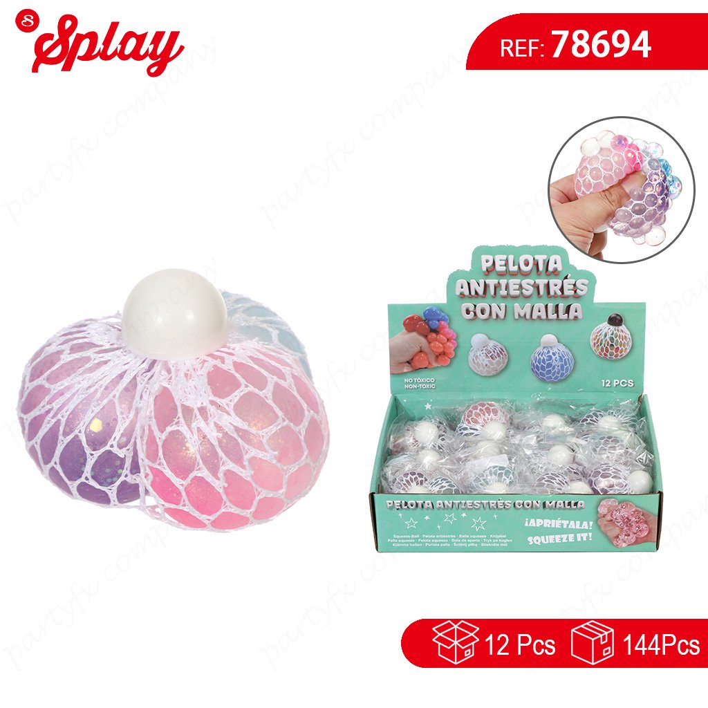 Pelota antiestrés con malla que crea efecto burbuja al presionar. Material suave y elástico, ideal para aliviar el estrés en niños y adultos.
