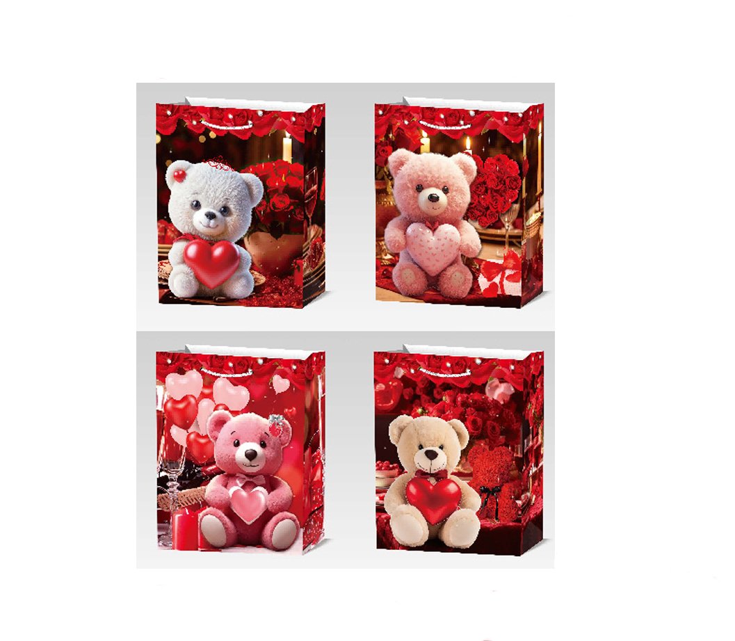 Bolsas de regalo de San Valentin con diseños romanticos y colores vivos.Disponibles en varios tamanos para diferentes tipos de obsequios.Perfectas para tiendas, detalles especiales y eventos tematicos.