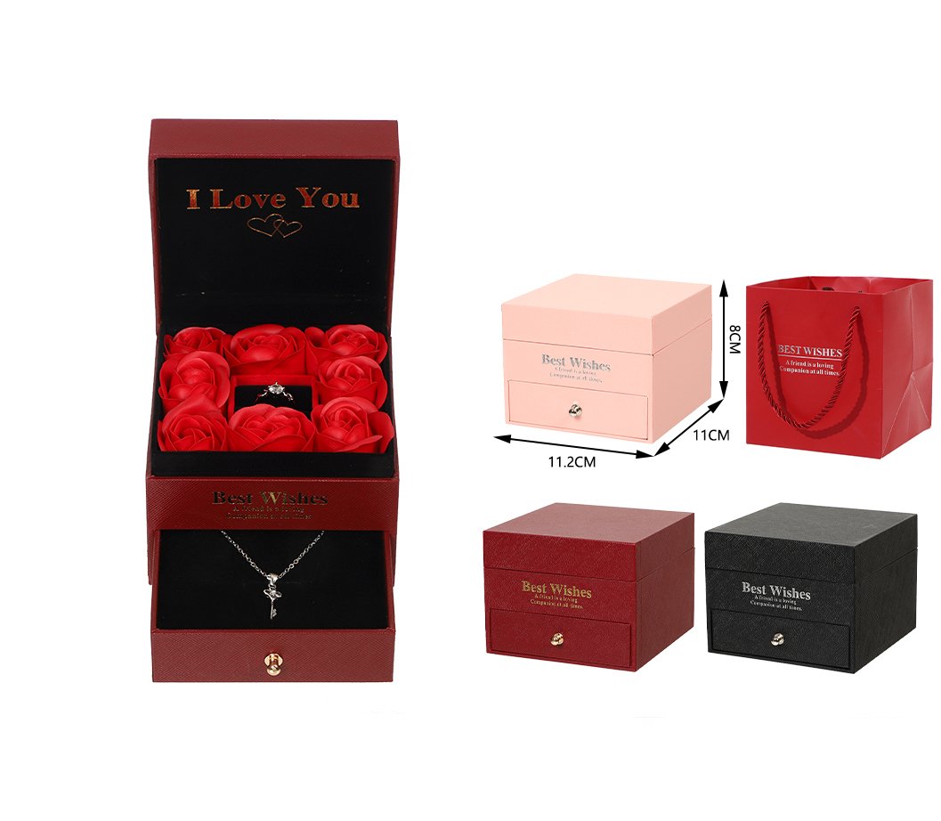 Elegantes cajas de joyero con rosa, diseñadas para realzar cualquier regalo romántico. Cada modelo combina flores eternas, compartimentos para joyas y una presentación premium con bolsa a juego. Ideales para San Valentín, aniversarios y detalles especiales que requieren una presentación cuidada y de alta calidad.