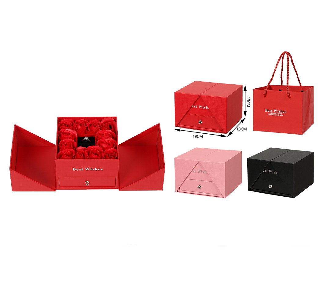 Elegantes cajas de joyero con rosa, diseñadas para realzar cualquier regalo romántico. Cada modelo combina flores eternas, compartimentos para joyas y una presentación premium con bolsa a juego. Ideales para San Valentín, aniversarios y detalles especiales que requieren una presentación cuidada y de alta calidad.