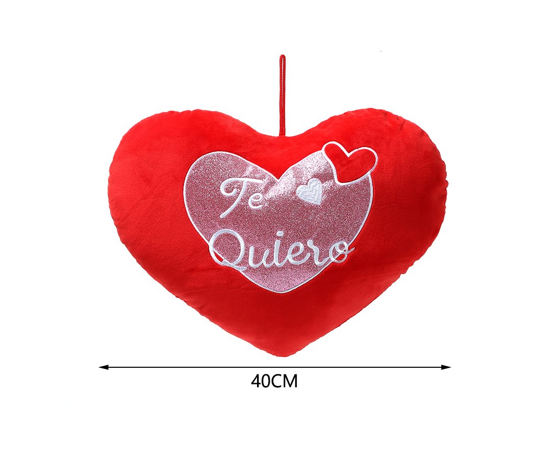 Cojines de peluche con forma de corazón, suaves y agradables al tacto. Disponibles en varios diseños bordados como Te Amo, Te Quiero o I Love You. Ideales para detalles románticos, decoración y temporadas especiales como San Valentín.