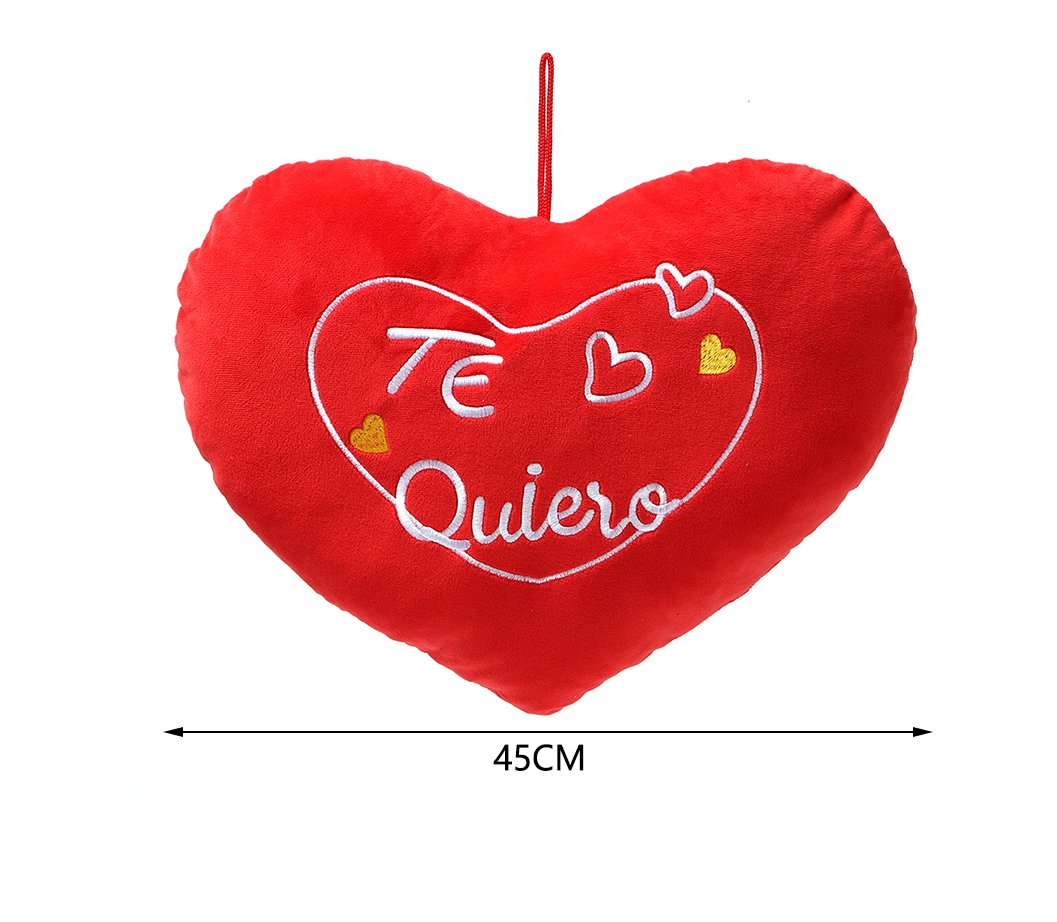 Cojines de peluche con forma de corazón, suaves y agradables al tacto. Disponibles en varios diseños bordados como Te Amo, Te Quiero o I Love You. Ideales para detalles románticos, decoración y temporadas especiales como San Valentín.