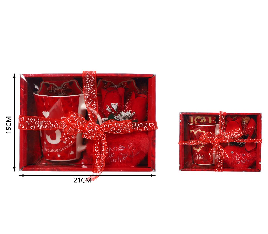 Corazon de peluche con rosa y taza – set de regalo