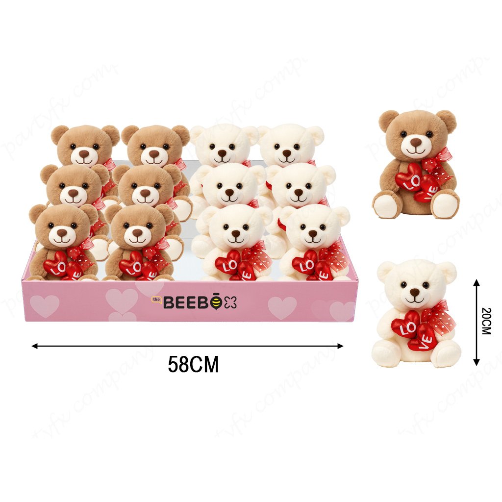 Expositor con 18 peluches surtidos, listo para colocar y vender directamente en tienda. Presentación atractiva y compacta, ideal para puntos de venta y campañas de San Valentín. Ofrece modelos variados para atraer diferentes gustos y aumentar la rotación.