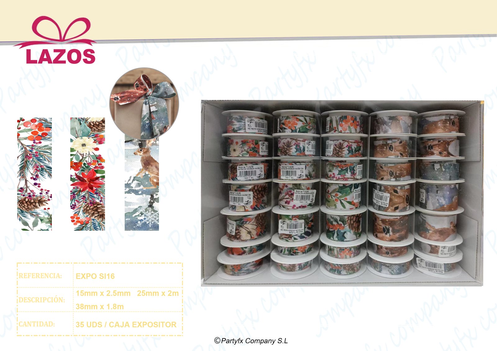 Lazos decorativos surtidos para regalo, disponibles en diferentes colores, tamaños y diseños. Ideales para decorar bolsas, cajas y paquetes de regalo, aportando un acabado atractivo y festivo. Perfectos para campañas estacionales, eventos y venta al por mayor.