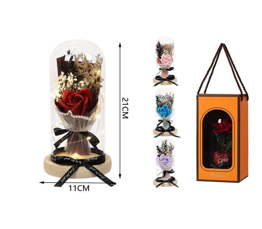 Elegantes flores preservadas dentro de una cúpula de cristal, combinadas con detalles decorativos y base de madera. Cada pieza incluye iluminación LED suave, ideal para crear un ambiente romántico y sofisticado. Perfecto para regalos, decoración del hogar y ocasiones especiales.