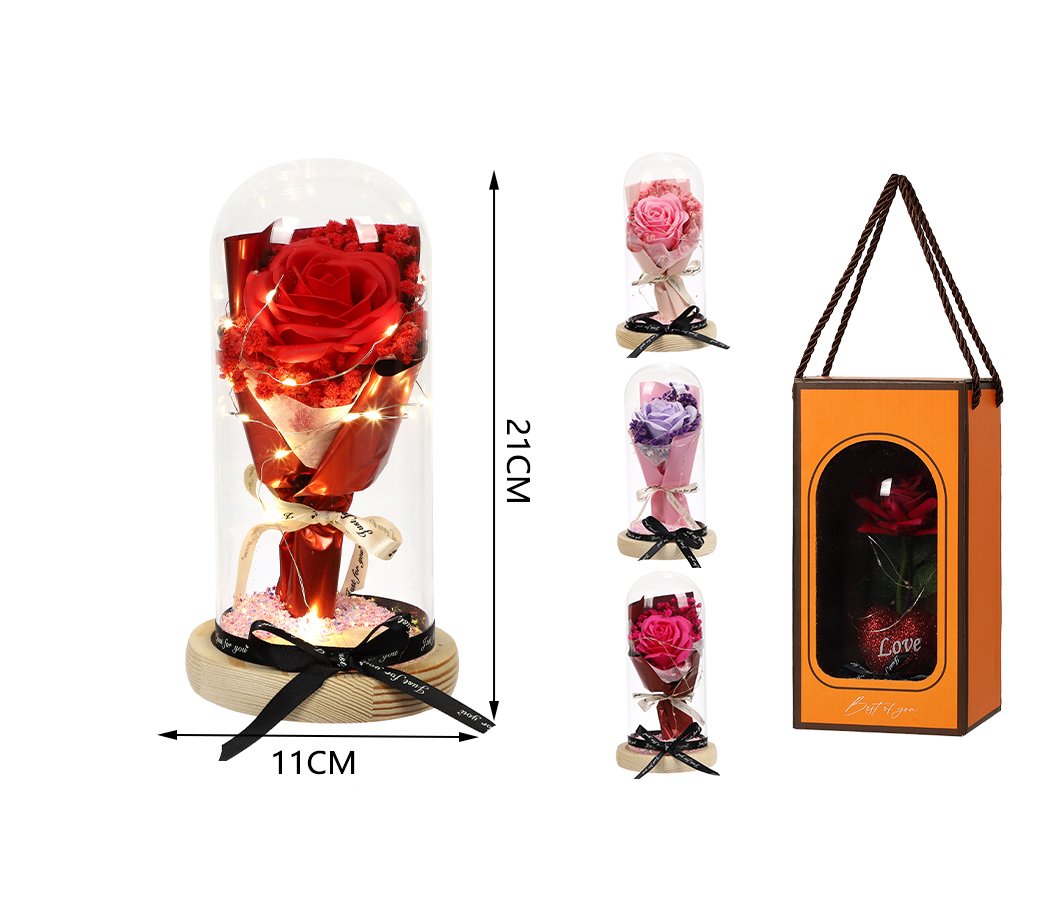 Elegantes flores preservadas dentro de una cúpula de cristal, combinadas con detalles decorativos y base de madera. Cada pieza incluye iluminación LED suave, ideal para crear un ambiente romántico y sofisticado. Perfecto para regalos, decoración del hogar y ocasiones especiales.