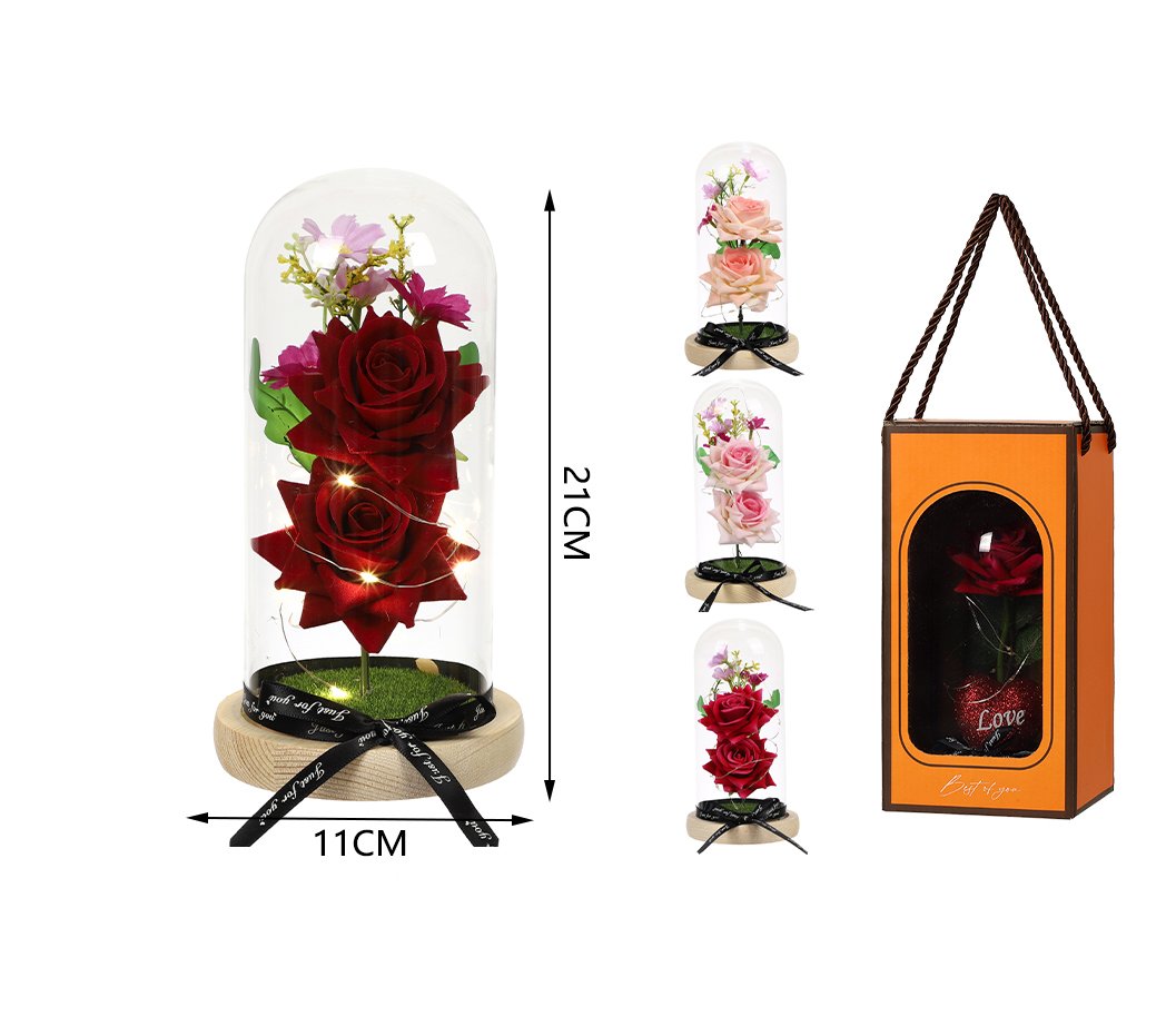 Elegantes flores preservadas dentro de una cúpula de cristal, combinadas con detalles decorativos y base de madera. Cada pieza incluye iluminación LED suave, ideal para crear un ambiente romántico y sofisticado. Perfecto para regalos, decoración del hogar y ocasiones especiales.
