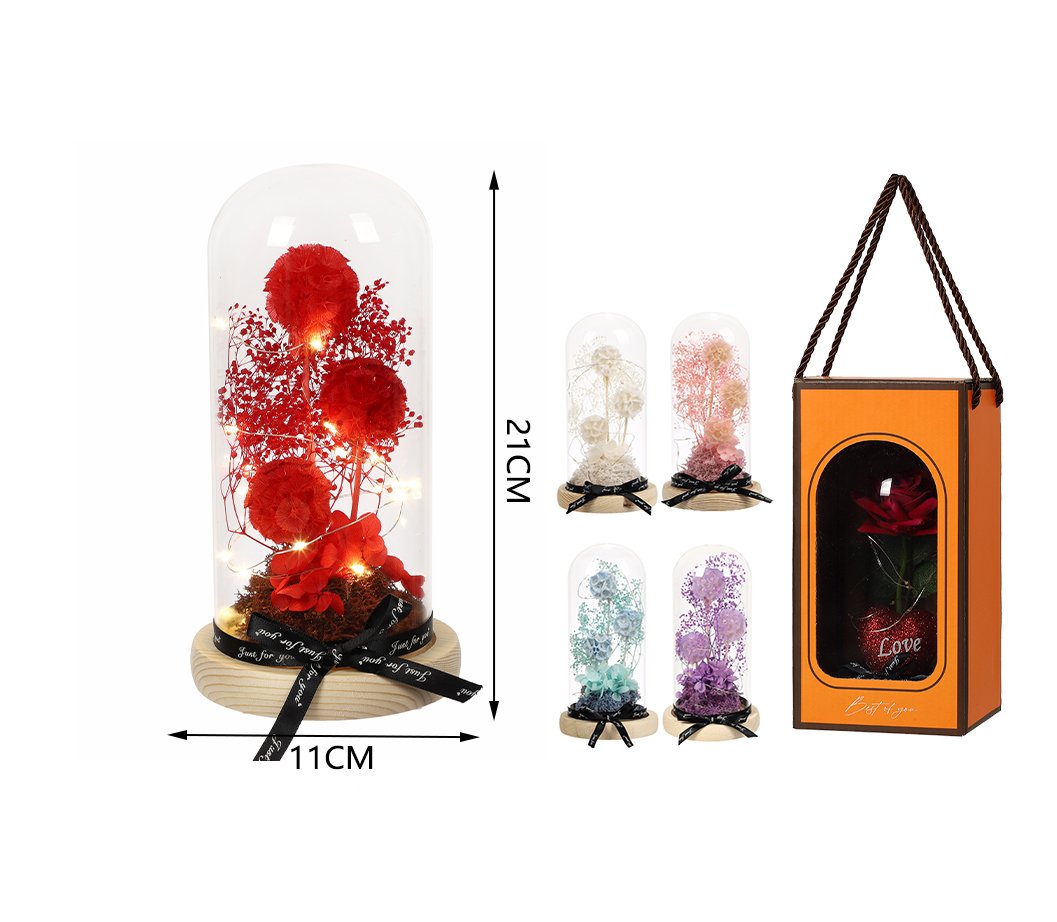 Elegantes flores preservadas dentro de una cúpula de cristal, combinadas con detalles decorativos y base de madera. Cada pieza incluye iluminación LED suave, ideal para crear un ambiente romántico y sofisticado. Perfecto para regalos, decoración del hogar y ocasiones especiales.