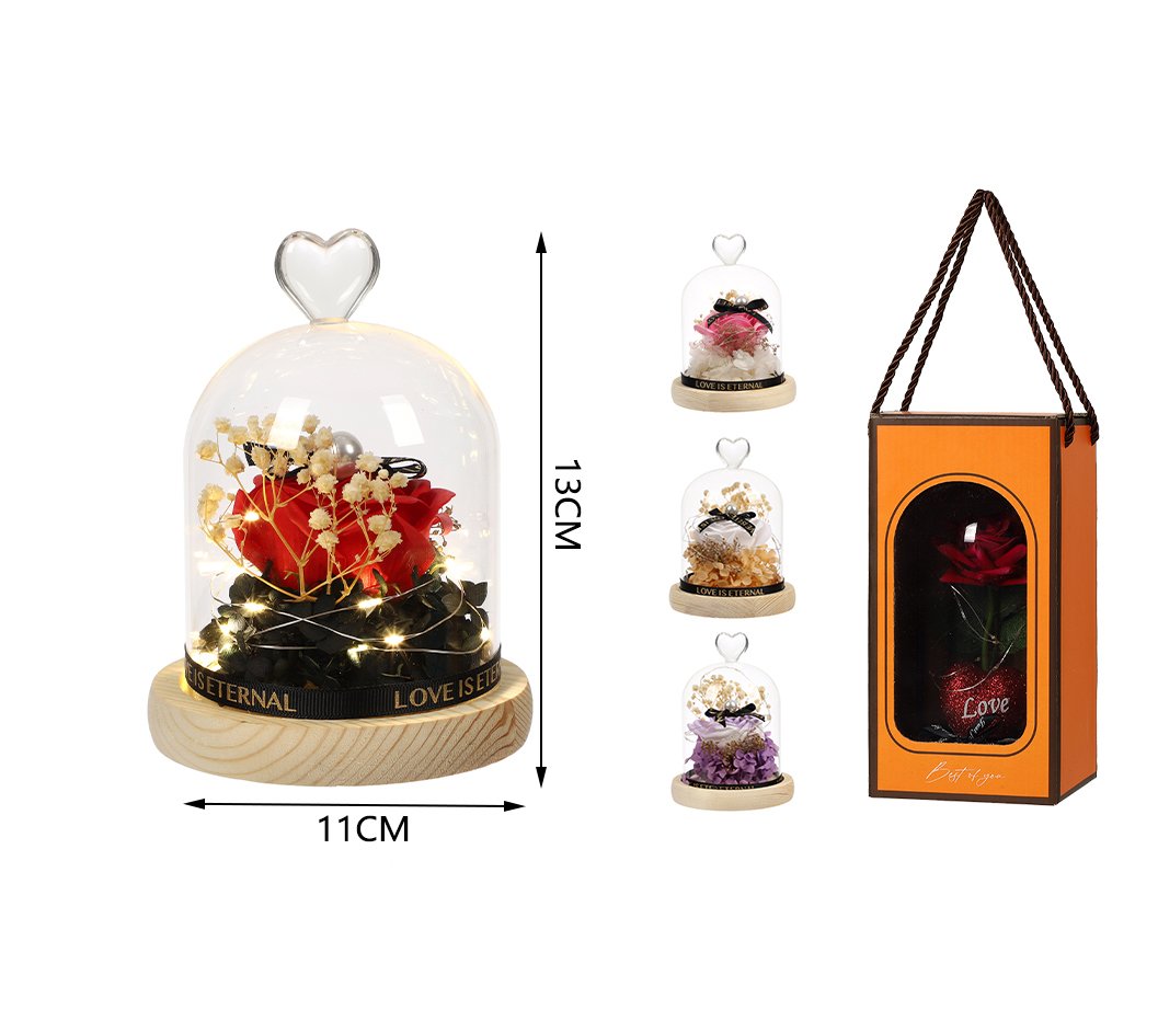 Elegantes flores preservadas dentro de una cúpula de cristal, combinadas con detalles decorativos y base de madera. Cada pieza incluye iluminación LED suave, ideal para crear un ambiente romántico y sofisticado. Perfecto para regalos, decoración del hogar y ocasiones especiales.