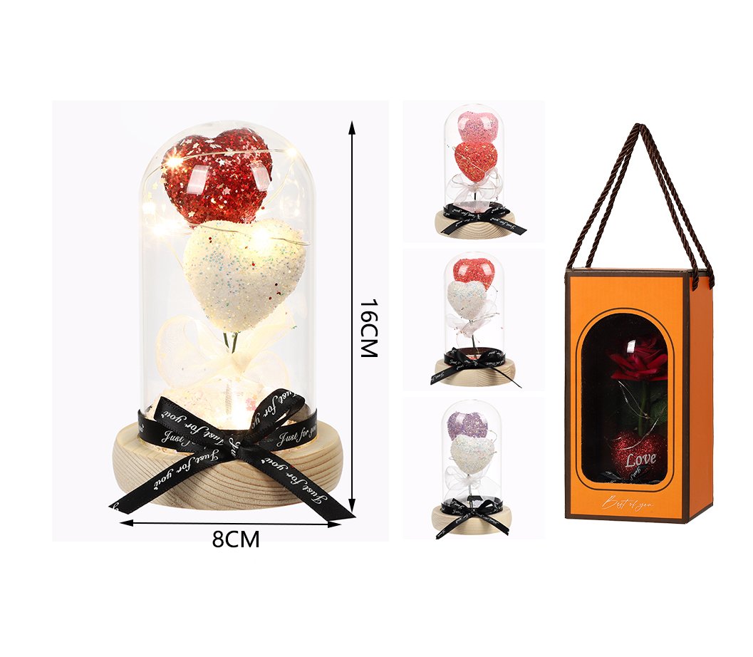 Elegantes flores preservadas dentro de una cúpula de cristal, combinadas con detalles decorativos y base de madera. Cada pieza incluye iluminación LED suave, ideal para crear un ambiente romántico y sofisticado. Perfecto para regalos, decoración del hogar y ocasiones especiales.