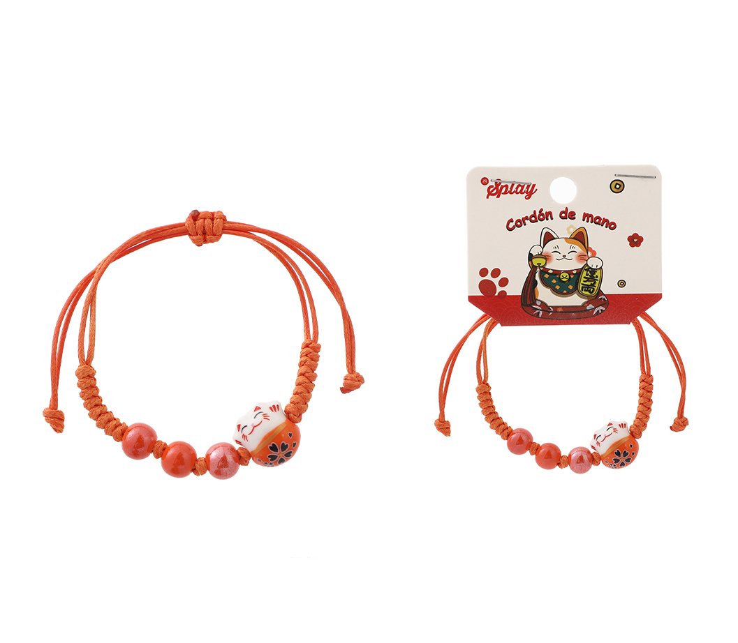 Pulseras coloridas inspiradas en el gato de la suerte, diseñadas para atraer fortuna y buena energía. Ligeras, ajustables y disponibles en varios colores, son perfectas para regalos, ventas al por menor y exhibidores temáticos.