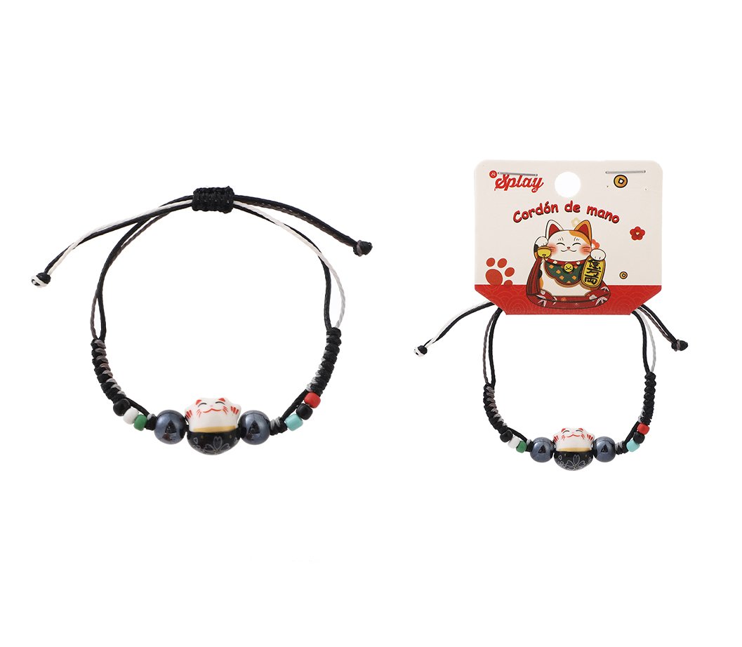 Pulseras coloridas inspiradas en el gato de la suerte, diseñadas para atraer fortuna y buena energía. Ligeras, ajustables y disponibles en varios colores, son perfectas para regalos, ventas al por menor y exhibidores temáticos.